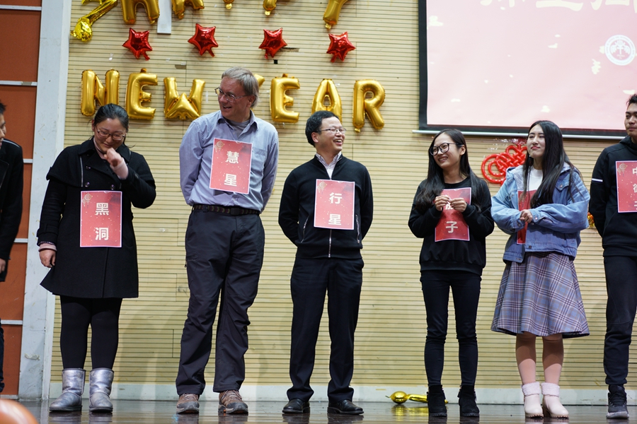 这几个高潮之后,主持人宣布进入游戏和抽奖环节。游戏先是击鼓传花,在全场选出了拿到花的十位师生,一起上台,挂上质子、中子、中微子等名牌,开始萝卜蹲。游戏拉近了师生们的距离,大家都非常努力的把对手淘汰,完全没有因为是老师而让步。