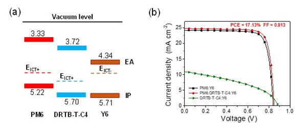 有机光伏电池(Organic solar cells)因具有柔韧性好、重量轻、易加工等优点受到广泛关注。近年来,受益于非富勒烯受体的发展,功率转换效率得到大幅度提高。与此同时,三元(Ternary)结构器件既保留了传统二元器件简单易操作的制备方式,又具有能够扩展活性层光吸收范围、优化形貌等特点,是获得高效率的重要途径。课题组利用紫外光电子能谱(UPS)原位表征技术,结合整数电荷转移ICT(Integer Charge Transfer)模型解析了有机半导体PM6:DRTB-T-C4:Y6三元异质结界面精细电子结构特性。研究发现PM6的EICT+和Y6的EICT-均是4.50 eV,虽然PM6:Y6界面ICT态重叠且电势差为零,其界面仍存在少量的基态整数电荷转移,从而促进激子分离,减小界面库仑力对光生载流子的束缚。第三组分DRTB-T-C4的EICT+ (4.65 eV)大于Y6的EICT-,DRTB-T-C4:Y6界面不存在基态电荷转移,进一步避免了ICT态陷阱辅助复合的发生。在此基础上,结合精密光谱,深入分析了PM6:DRTB-T-C4:Y6活性层的光电转换动力学。最终指导构建了填充因子(fill factor)为0.813的有机光伏电池,这是当前三元有机光伏电池的最高值(Advanced Materials 2020, 32, 2002344)。
