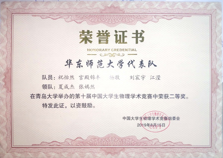 2019年8月15日,从第十届中国大学生物理学术竞赛(CUPT)上传来喜讯,由物理与电子科学学院2018级本科生组成的华东师范大学代表队斩获本次比赛二等奖,在65支参赛队中总成绩位列第17位,创造了我校自参赛以来的最好成绩。
