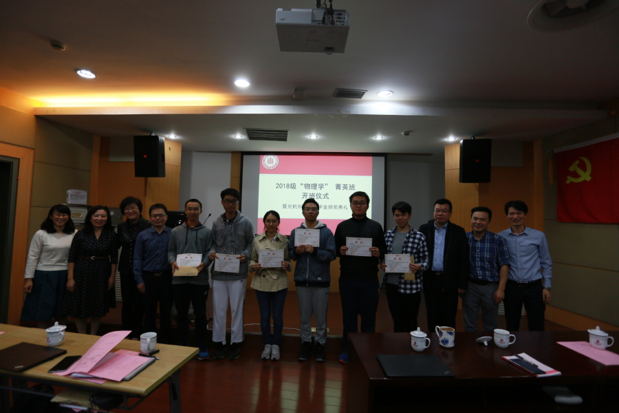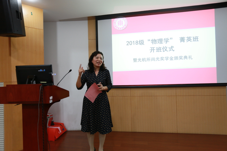 10月23日上午10:00,物理与材料科学学院2018级物理学菁英班开班仪式暨光机所尚光奖学金颁奖活动在物理楼226报告厅顺利举行。中科院光机所强场激光物理国家重点实验室副主任刘鹏、人事教育处副处长丁虹、所团委书记金黎慧,副校长孙真荣、物理与材料科学学院书记李恺、院长程亚、副院长周先荣、光华书院书记赵旌旌、院长温玉亮及教务处副处长谭红岩出席了活动。光华书院代表、菁英班班主任以及2018级30位菁英班同学参加了此次开班和颁奖活动。活动由物理与材料科学学院书记李恺主持。