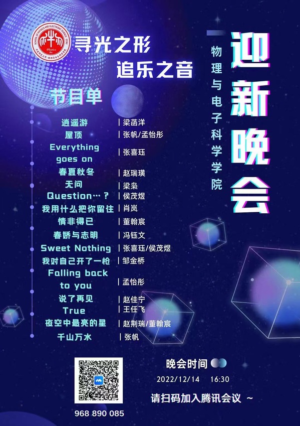 12月14日,物理与电子科学学院举办“寻光之形追乐之音”线上迎新年音乐会,同学们欢聚一堂、畅叙情谊、共迎新年。