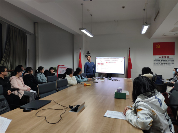 11月23日,电子研究生党支部在第三教学楼220教室组织“踔厉奋发担使命、勇毅前行谱新章”主题党日活动,党支部书记隋峰锐以“学习党的二十大新观点、新思想”为题作学习分享,党支部副书记张玲玲解读新党章。