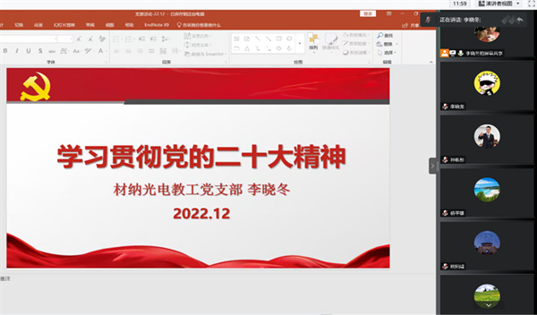 12月28日中午,纳光电工程中心教工党支部线上专题学习党的二十大精神。支部书记李晓冬领学党的二十大报告,他详细介绍了报告的主题、意义和重要观点,对党的二十大报告进行了深入阐释,并引导支部党员进行了深入交流研讨。