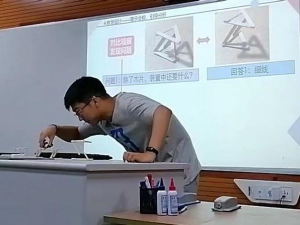 本科生组的参赛选手带来了更多有趣的科普实验。李俊同学在《牛顿的棺材板真的压不住了吗——探究反重力的张拉结构》的实验设计部分,拿出了自制的一个个小巧玲珑的结构,通过剪断不同位置的细线,帮助同学们对“反重力结构”进行受力分析;撒米多同学通过模具,讲述《受迫振动》中神奇的物理现象;肖雁之同学全面、系统地分析了纸飞机中的物理学原理。
