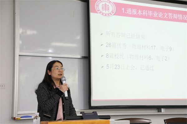 学院副院长徐敏通报本科论文答辩、本科教学评估工作等近期本科教学工作推进情况,并对系统存档版论文确认工作、第二轮论文抽检、下学期教学大纲上传、期末试卷收集等工作的时间节点进行提醒。
