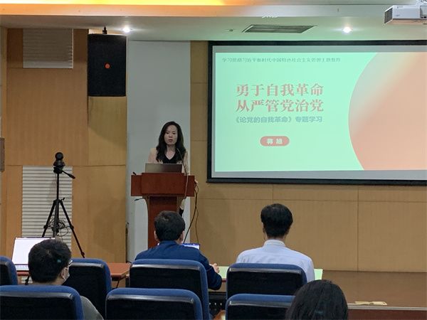 学院党委副书记蒋旭首先为全体师生党员上“勇于自我革命 从严管党治党”专题党课,她梳理了自我革命战略思想的提出、内涵和意义,并围绕党的二十大报告中关于全面从严治党的相关部分,作进一步强调。蒋旭谈到,推进自我革命是对党的优良传统和根本宗旨的传承,是破解大党独有难题和化解风险的“金钥匙”,希望通过理论学习,进一步加强思想建设、勇于自我革命。