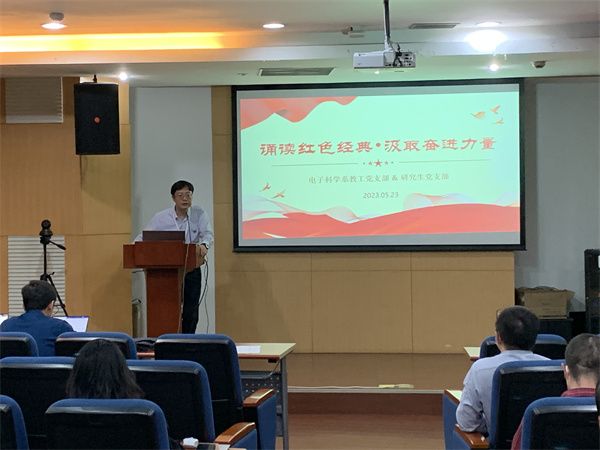 5月24日上午,电子科学系教工党支部、电子研究生党支部在物理楼226报告厅联合举办“诵读红色经典,汲取奋进力量”主题党日活动,60余名党员参会。会议由电子科学系教工党支部书记黄荣主持。