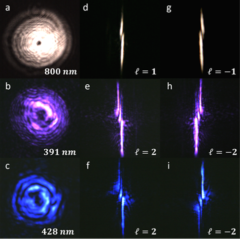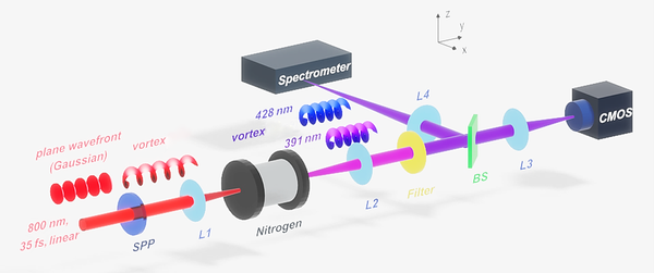 该团队利用携带轨道角动量(orbital angular momentum,OAM)的近红外飞秒激光脉冲泵浦氮气分子,首次实现了涡旋氮气离子激光的产生,为可切换波长高亮度远程结构光场产生提供了一种新方案。