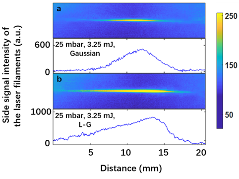 更令人惊喜的是,在高泵浦脉冲能量下,相比于高斯光束作为泵浦光的情况,涡旋泵浦可以达到更高的氮气离子激光产生效率:泵浦光的涡旋结构降低了光丝的轴上等离子体密度,减少了等离子体对激光脉冲的散焦作用,打破了固有的光强钳制效应。这得益于涡旋泵浦光诱导的飞秒光丝在高泵浦脉冲能量下表现出空间尺度更长,能量分布更均匀的特性。氮气离子激光强度较低一直是阻碍其进入广泛应用的问题,这一发现为氮气离子激光的放大提供了一种巧妙的方案:通过对泵浦光进行精细调整,来改变飞秒光丝的空间分布,最终优化出最适宜氮气离子激光产生的条件。