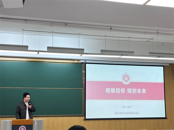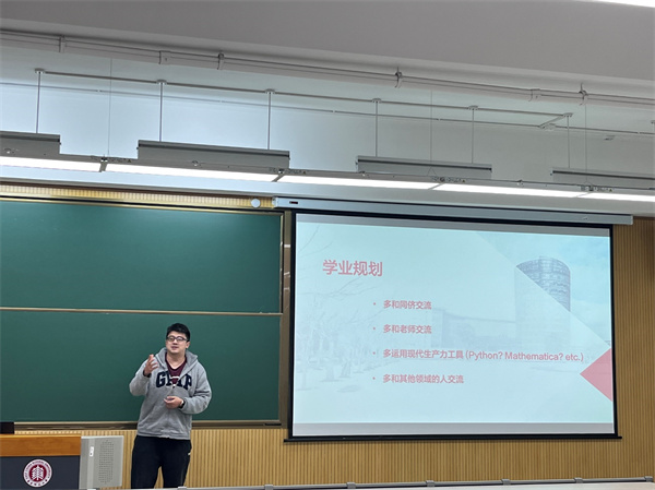 刘胜帅以《大学,学什么》为题,详细介绍了大学的学业规划。他建议,大一阶段要认真学习基础课程、巩固基础,初步了解学科竞赛,尝试以团队的形式参加学科竞赛,适当参加学生工作与社团活动;大二阶段要学习专业课程,积极参与学科竞赛,培养多学科交叉的综合思维能力,将所学知识运用于实际问题中;大三阶段要钻研课程,尝试接触科研课题,申报学生科研项目;大四阶段要明确未来发展方向。除此之外,他着重介绍了各种物理学科竞赛,鼓励同学们自我正向激励、在多学科交叉背景下提高个人素质。