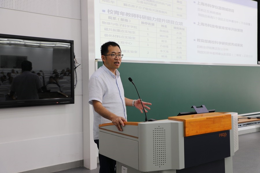10月16日,物理与电子科学学院在闵行一教106报告厅召开全院教职工大会,增补学院第二届教代会代表,通报学院近期重点工作,围绕“双创”开展集中学习,学校创新创业学院常务副院长阮平章应邀作主题报告。会议由学院常务副院长段纯刚主持。